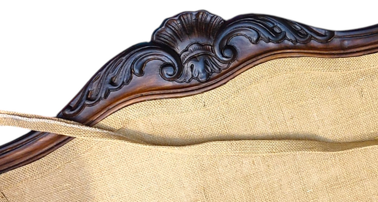 Titre : Fauteuil Rococo restaurĂ© + coussin recto-verso â toile de jute cafĂ©, bois brĂ»lĂ© & finitions incarnĂ©es